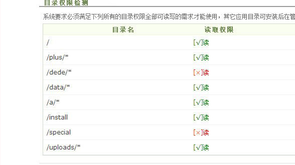 另外,由于我們修改後台名等其他内容,所以安裝時候會出現這樣的情況,這個不用擔心,隻是系統沒找到我們這個文件夾,因爲我們修改了,大家直接下一步即可,但是如果你發現全部都(dōu)是紅色叉叉,那就(jiù)是你空間權限問題了。