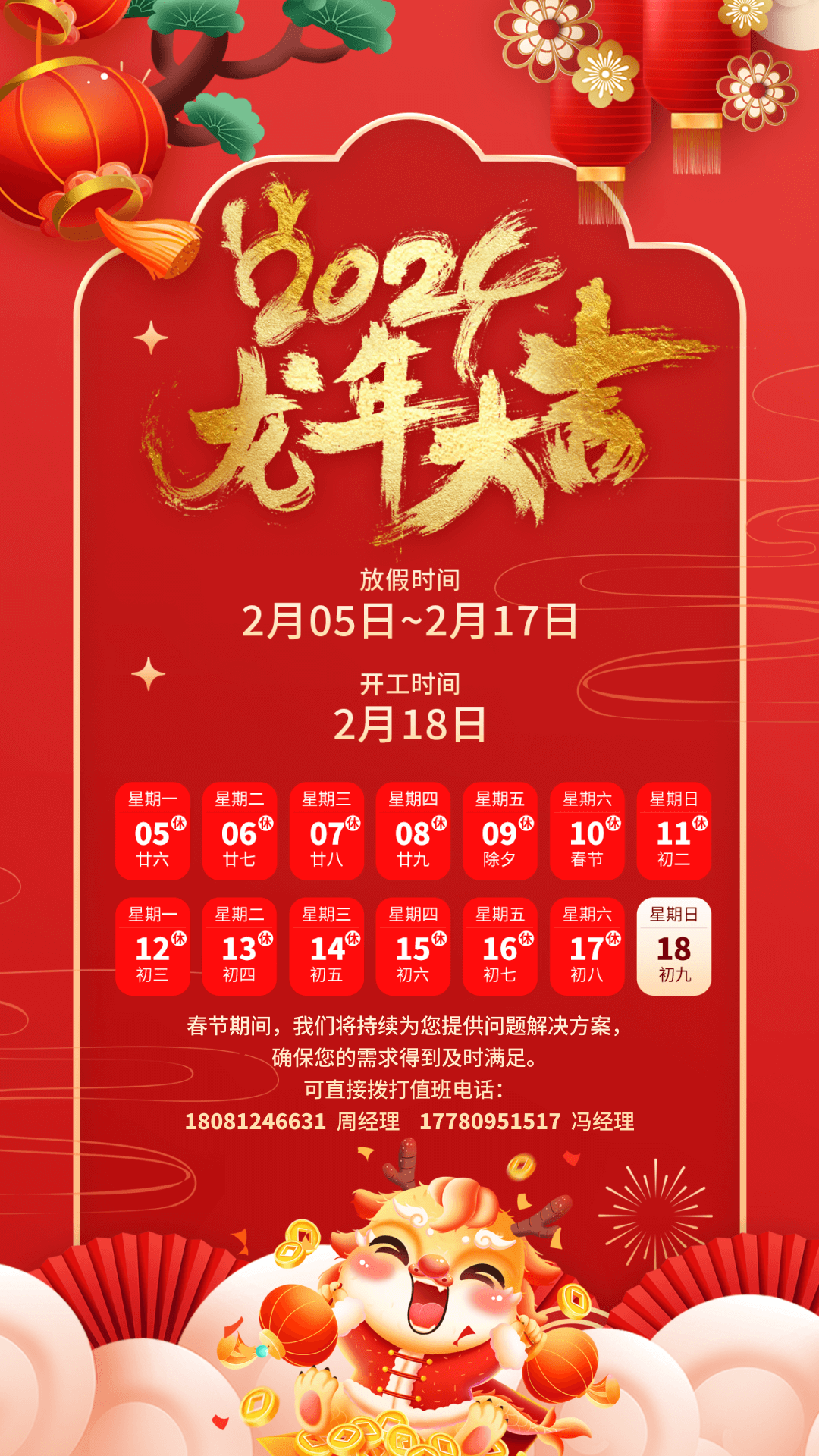 2024年新春佳節將(jiāng)至,根據國家的法定節假日規定及結合本公司實際情況,現將(jiāng)2024年春節放假時間作如下安排: