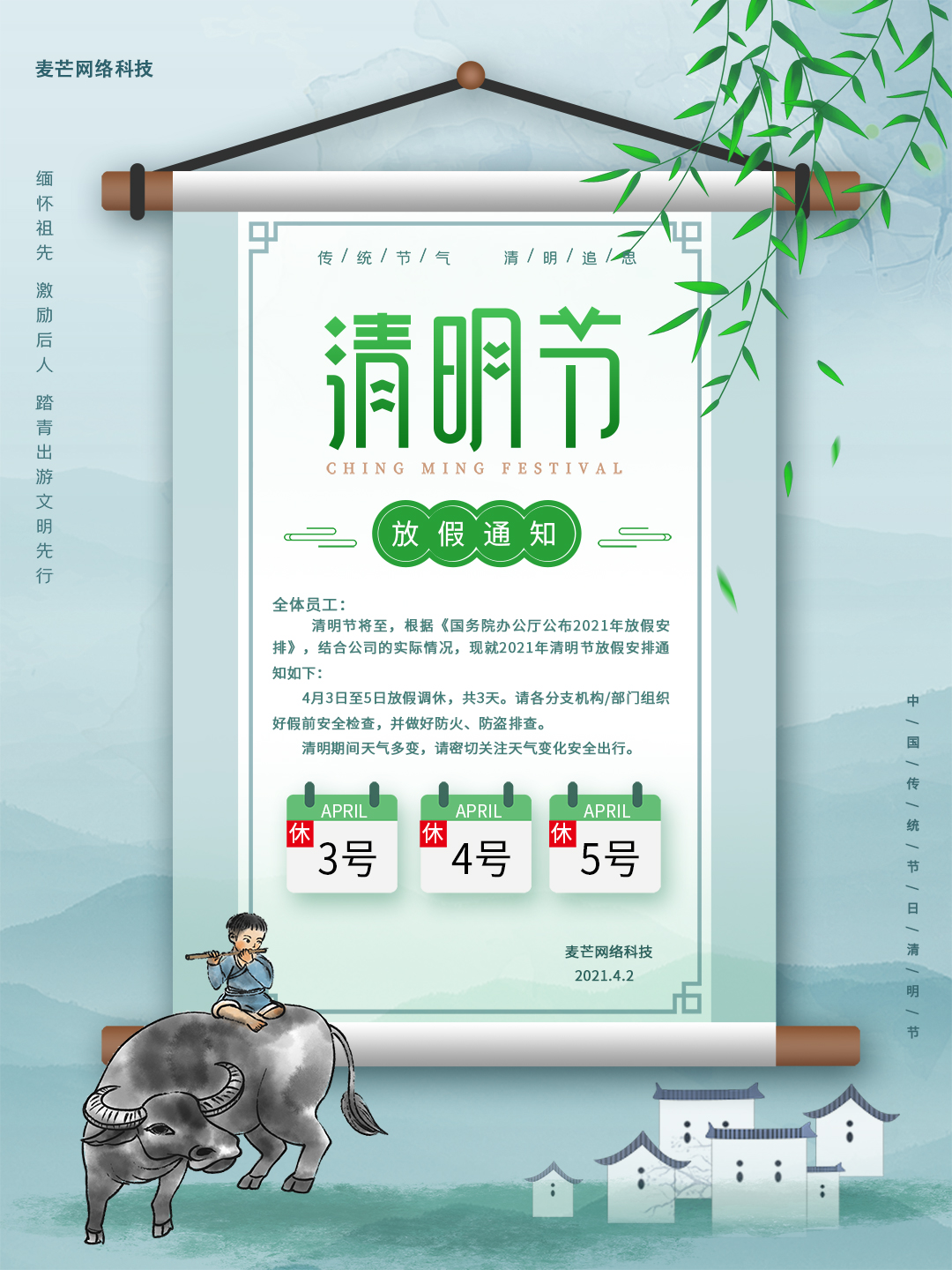 根據國務院辦公廳通知精神,我司現將(jiāng)2021年清明節放假安排通知如下: