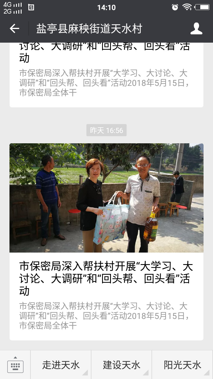 全村幅員面(miàn)積3.4平方公裏,耕地943畝、林地2950畝。轄9個村民小組,2017年底,共有426戶1057人。2014年被(bèi)确定爲省定貧困村,全村建檔立卡貧困戶63戶151人,貧困發生率達14.3%。2014年至今,在綿陽市環境保護局、綿陽市保密局、鹽亭縣環境保護局等部門的對口幫扶下,天水村聚焦“算得攏的收入、看得到的變化、靠得住的保障、掙得到的能(néng)力、信得過的認可”分戶施策,精準發力,充分運用好(hǎo)各項扶持政策,按照“六個精準”“五個一批”的總體要求,圍繞“一水二路三産業”的脫貧思路,在基礎設施建設、産業發展、公共配套設施的提檔升級,在群衆增收上找路子,在産業發展中求突破,措施得力,成(chéng)效明顯,2017年底成(chéng)功摘帽,實現整村脫貧。